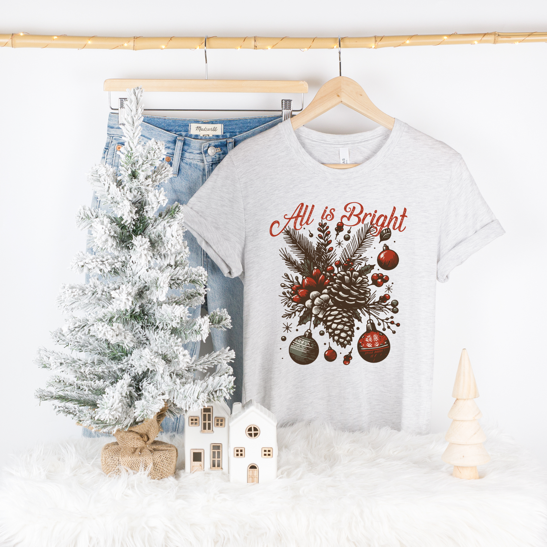 ALL IS BRIGHT CHRISTMAS TEE on a sand, heathered gray, cream or white colored Bella + Canvas Unisex Tee.
