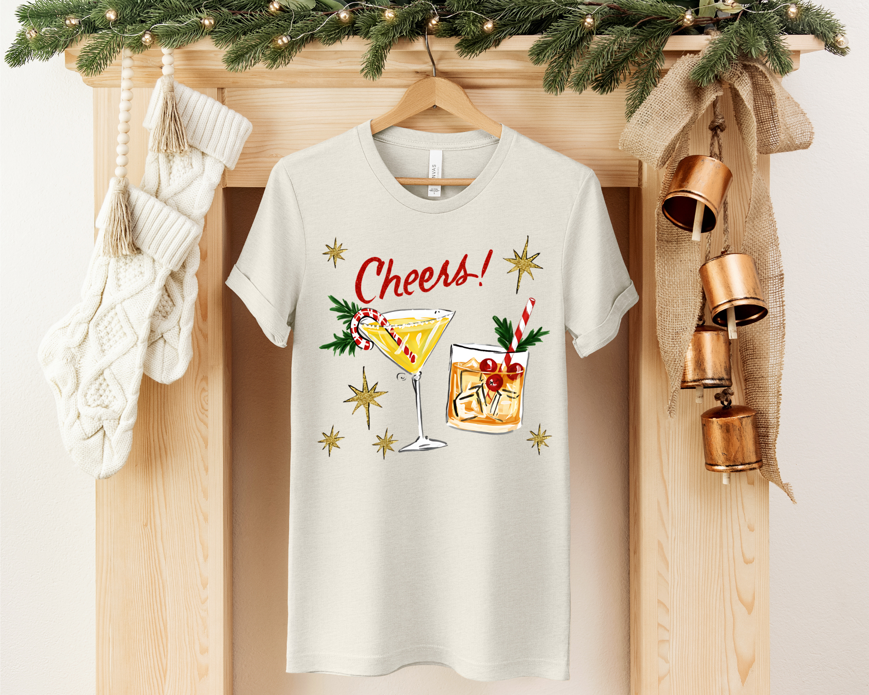 CHEERS HOLIDAY GRAPHIC TEE on a sand, heathered gray, cream or white colored Bella + Canvas Unisex Tee.