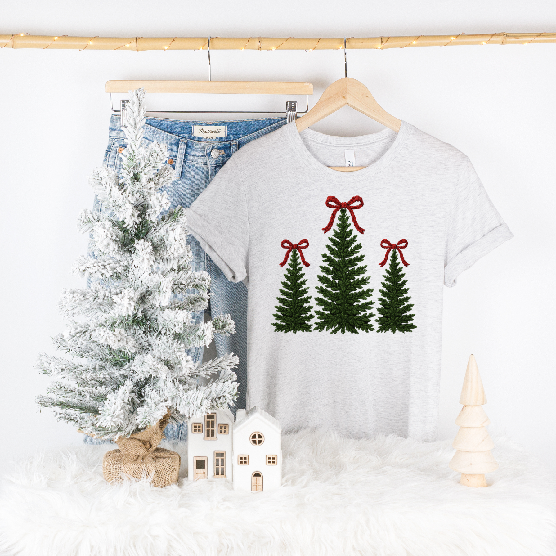 FAUX YARN CHRISTMAS TREE TEE on a sand, heathered gray, cream or white colored Bella + Canvas Unisex Tee.