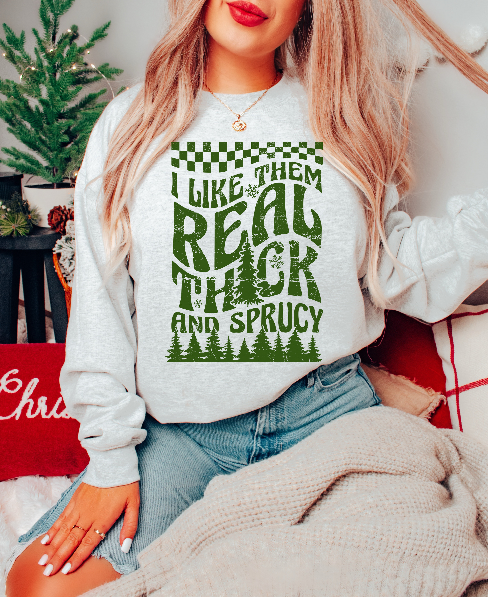 I LIKE THEM REAL THICK AND SPRUCY CREWNECK SWEATSHIRT is printed on sand, ash, white, or cream colored cozy crew