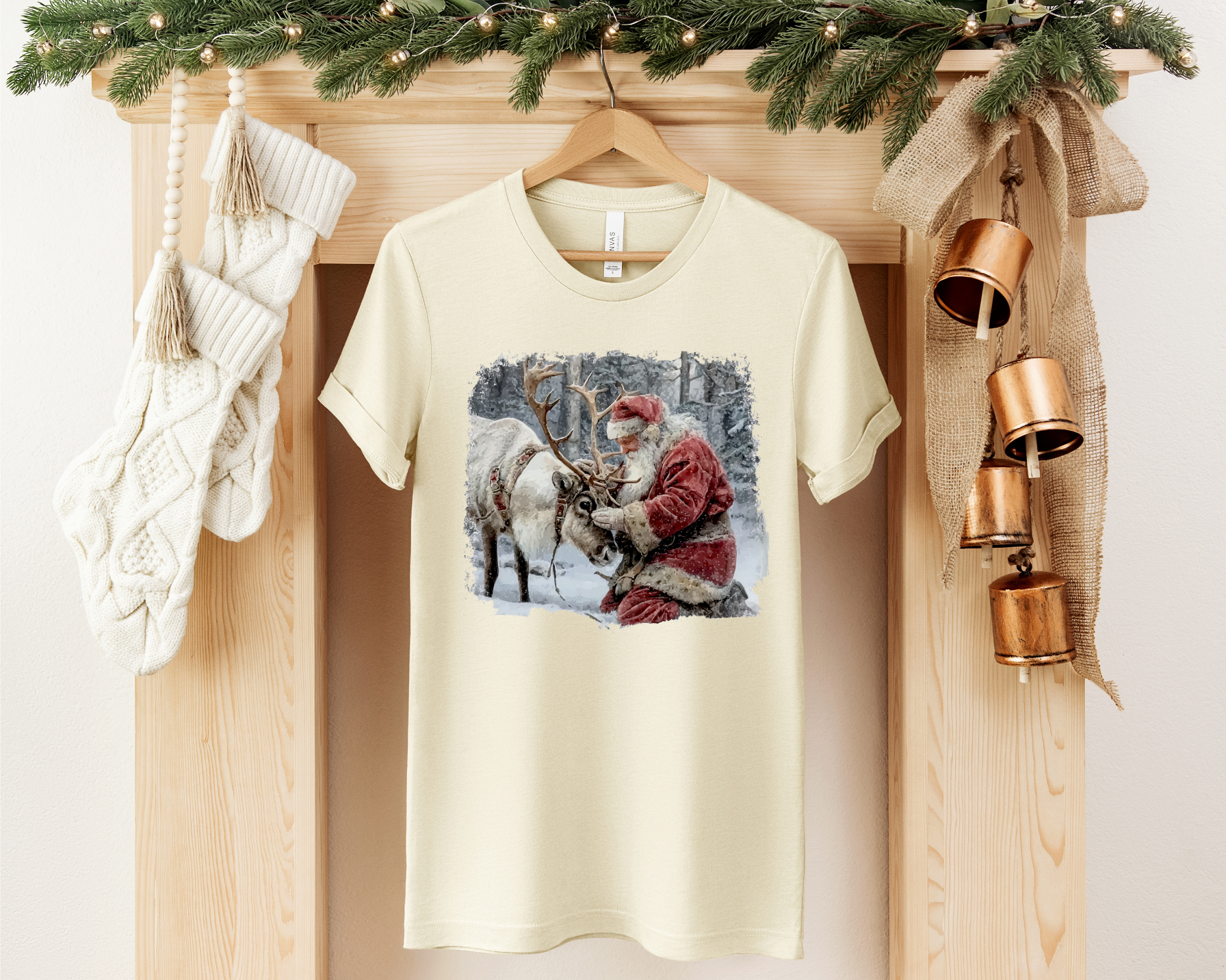 SANTA + REINDEER WINTER CHRISTMAS TEE on a sand, heathered gray, cream or white colored Bella + Canvas Unisex Tee.