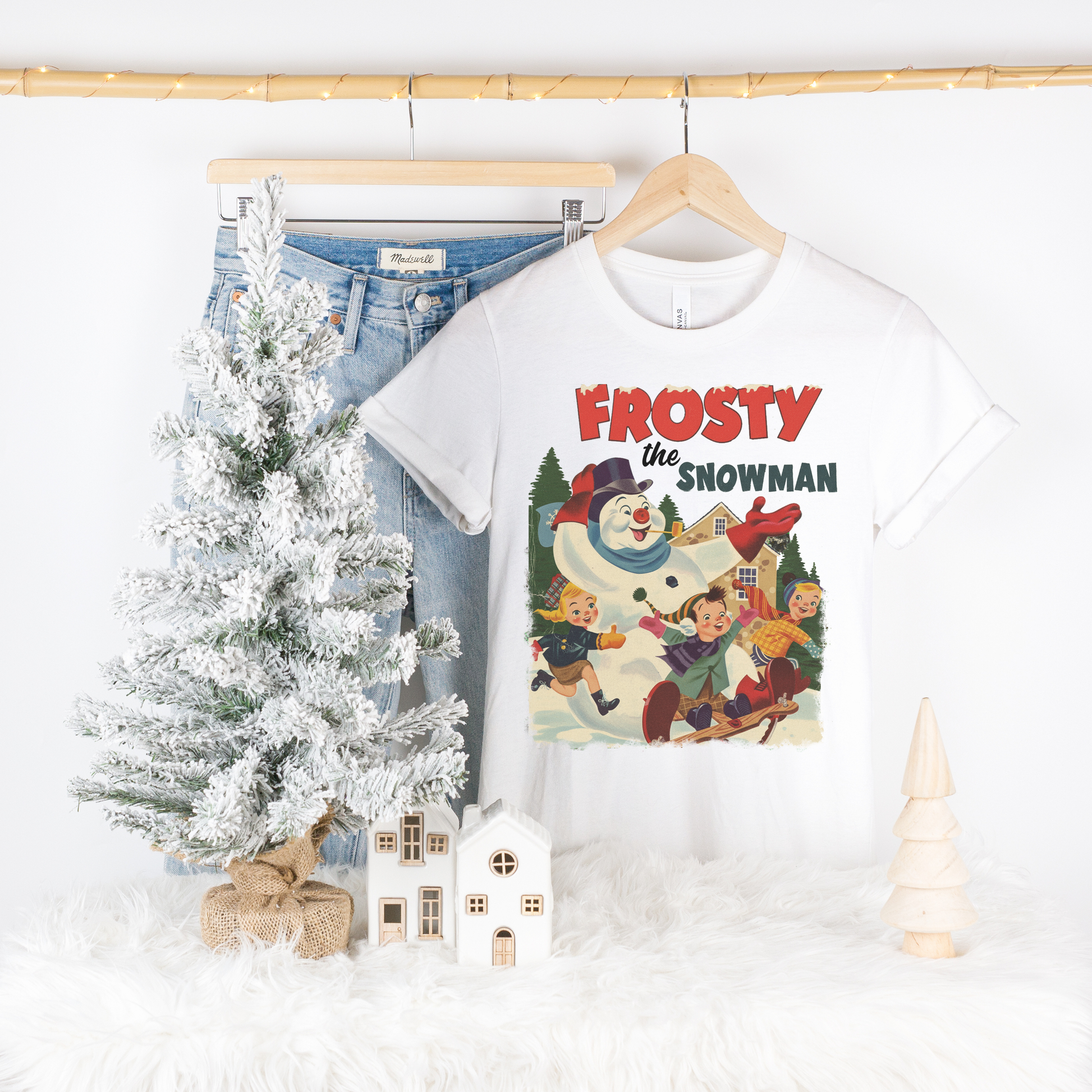 VINTAGE FROSTY THE SNOWMAN CHRISTMAS TEE on a sand, heathered gray, cream or white colored Bella + Canvas Unisex Tee.