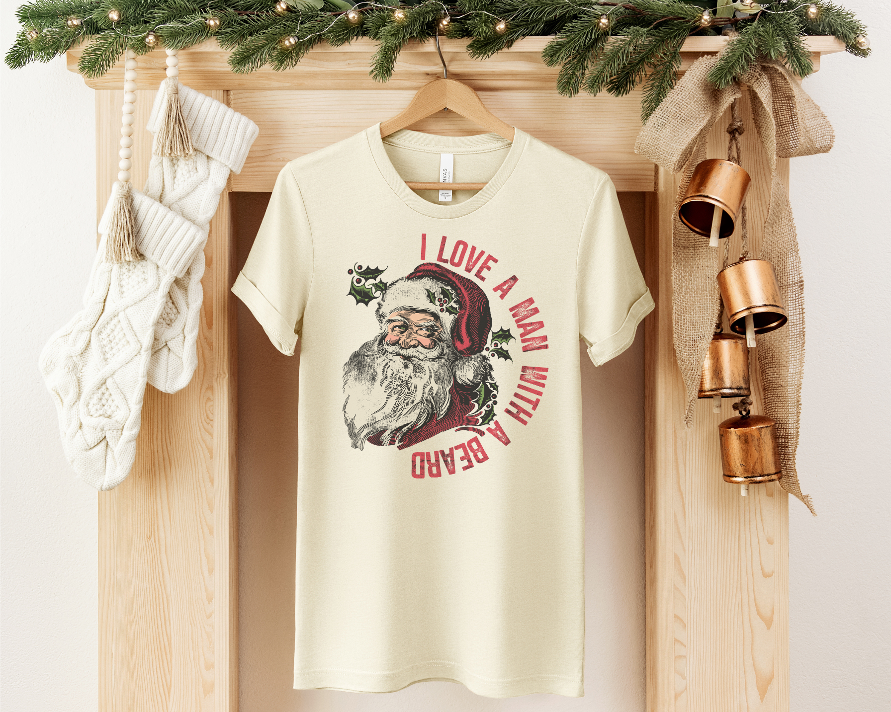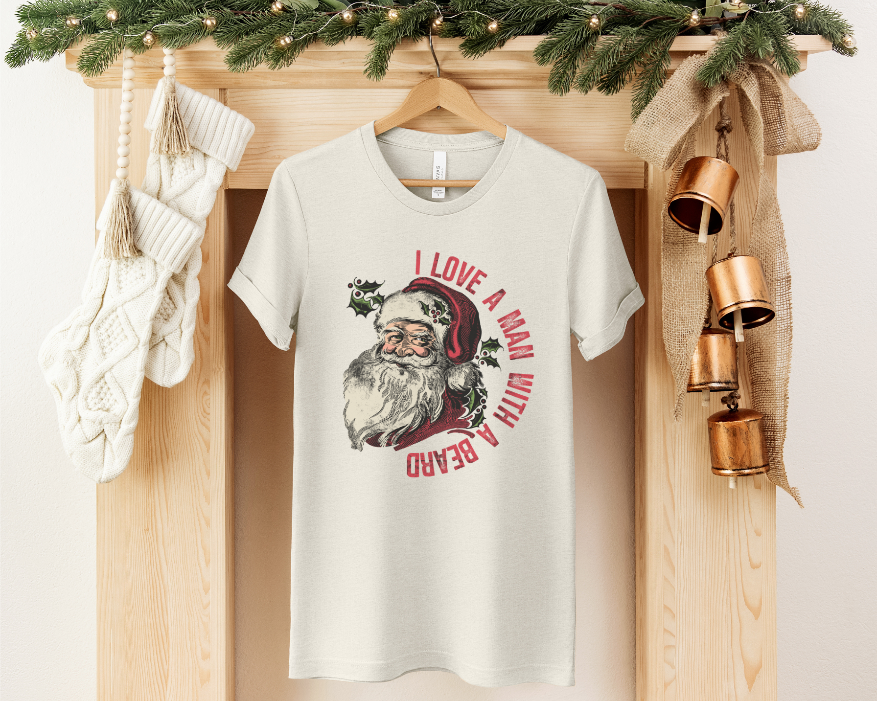 I LOVE A MAN WITH A BEARD SANTA GRAPHIC TEE on a sand, heathered gray, cream or white colored Bella + Canvas Unisex Tee.