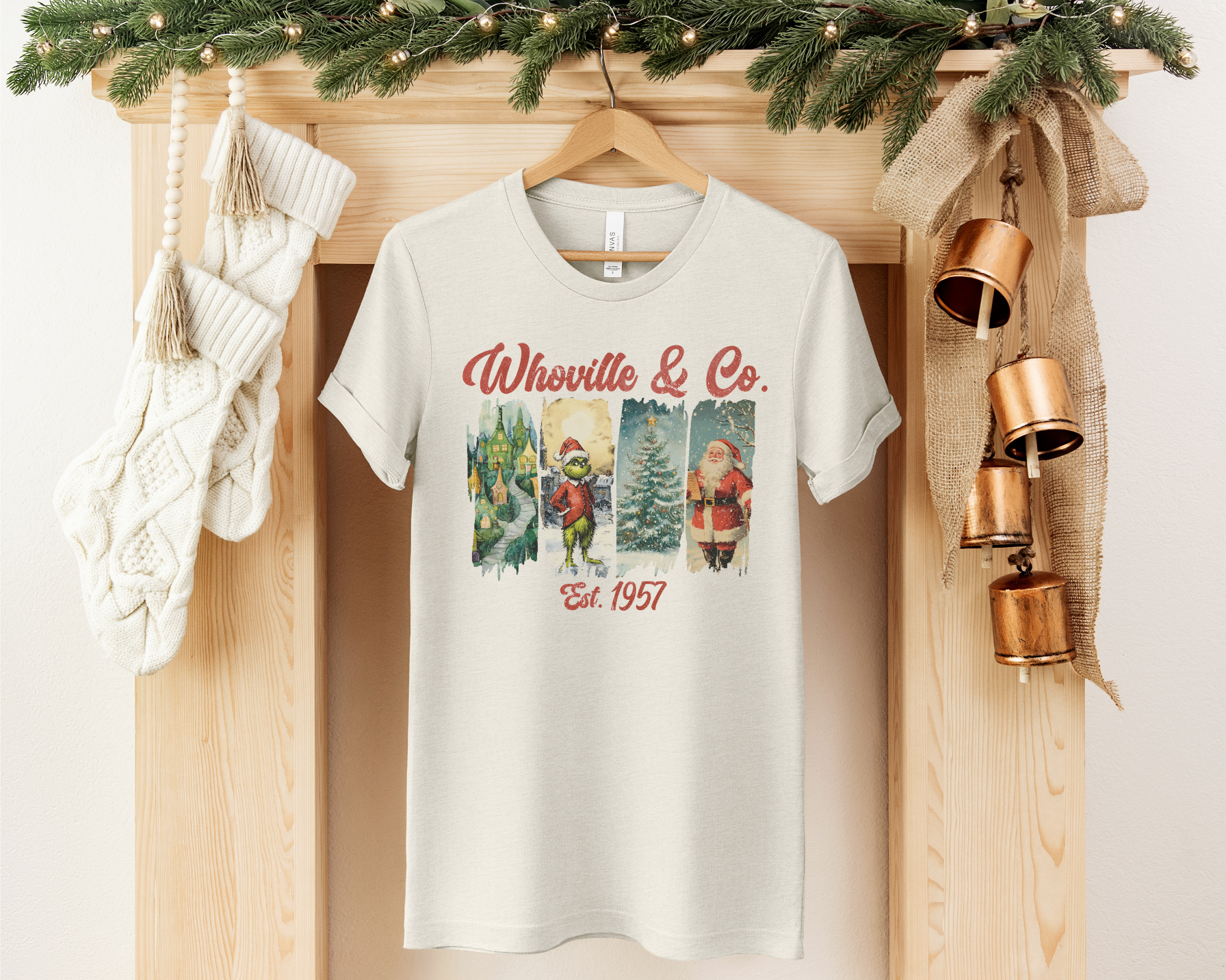 WHOVILLE + CO. THE GRINCH GRAPHIC TEE on a sand, heathered gray, cream or white colored Bella + Canvas Unisex Tee.